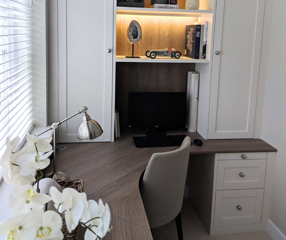 If you need to store printers, paperwork, files or more, then floor to ceiling cupboards are a great option. They don’t take up much room and have loads of space to store a lot of equipment. Most home offices aren’t very big. Studies that are pre-built in homes are often only a maximum of 8ft x 8ft (we are old school!) so space is always at a premium and requires good planning.